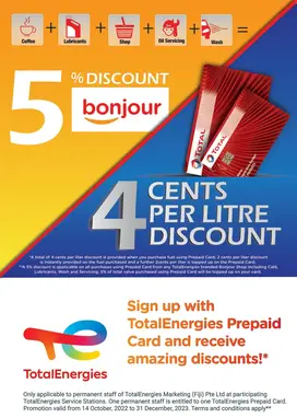 A total of 4 cents per litre discount is provided when a TotalEnergies Marketing (Fiji) Pte Ltd permanent staff purchases Fuel (Excellium unleaded or Excellium diesel or Premix or Kerosene) using a TotalEnergies Prepaid Card from selected TotalEnergies Service stations. 2 cents per litre discount is instantly provided on the fuel purchased and additional 2 cents per litre discount is topped up on the Prepaid Card. A 5% discount is applicable on all purchases using TotalEnergies Prepaid Card from participating TotalEnergies branded Bonjour shop including Café, Lubricants, Wash and Quartz Auto Service Lube bays. This 5% of total value purchased at the participating Bonjour shop using TotalEnergies Prepaid Card will be topped up on the Prepaid Card.